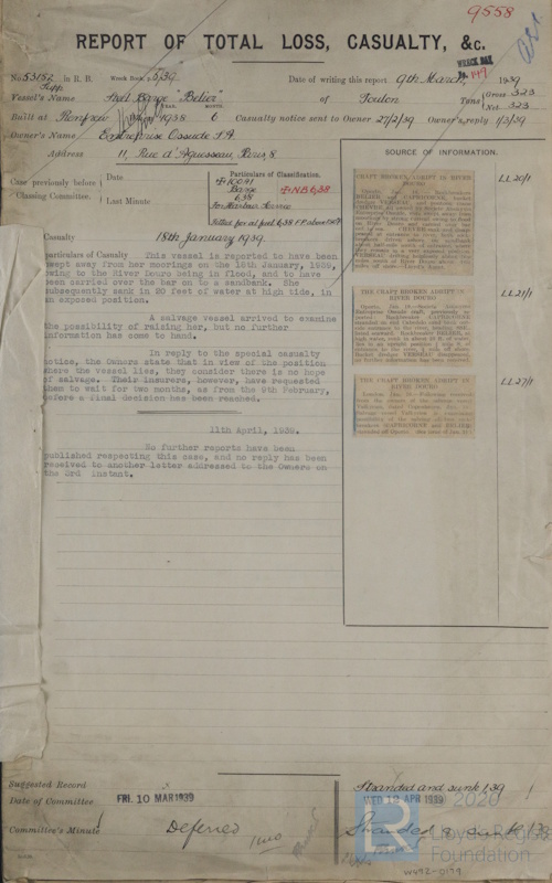Na tarde de 18 de janeiro de 1939, por volta das 17 horas, quatro embarcações — os quebra-rochas Belier e Capricorne, a draga Verseau e o batelão-grua Chevre — foram levadas rio abaixo pela força das águas do Douro.